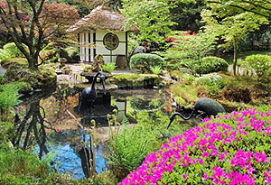 There is plenty of symbolism to embrace with natural elements, and while Western landscaping is about visual appeal, the Japanese prefer the spiritual setting. Their gardens have the following features: water, whether through channels, streams or cascades; volcanic rock to represent mountains, smooth round rocks for stepping stones, hard rocks for waterfalls; bridges; stone lanterns and water basins for washing hands prior to the tea ceremony; fences and gates. Trees are trimmed, their growth controlled in a technique called Niwaki which keeps trees looking ancient. Japanese plants and flowers include cherry, pine, bamboo, cedar and azaleas. (I have a set of Japanese Flower cards that represent each of the twelve months with these popular flowers). There are also fishes – carp and goldfish.