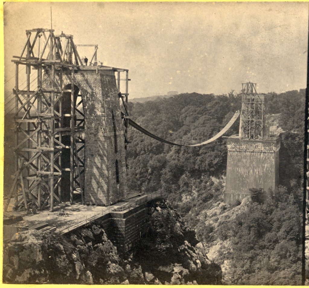 Brunel’s design was a suspension bridge with Egyptian themed towers and lots of iron. But money continued to be an issue. Investors went broke, funds were exhausted and work stopped in 1843. The ironwork was sold and used to construct another Brunel bridge – Royal Albert (railway) Bridge. Those brave enough to cross the gorge used a basket suspended between the two stone towers using the 300 metre iron bar which spanned the gorge and transported materials across.